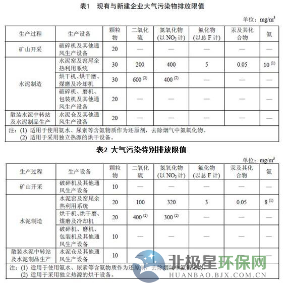 根據(jù)國(guó)家標(biāo)準(zhǔn)(GB4915 2013水泥工業(yè)大氣污染物排放標(biāo)準(zhǔn)),一般地區(qū)企業(yè)執(zhí)行表1的大氣污染物排放限值,重點(diǎn)地區(qū)企業(yè)執(zhí)行表2特別排放限值。