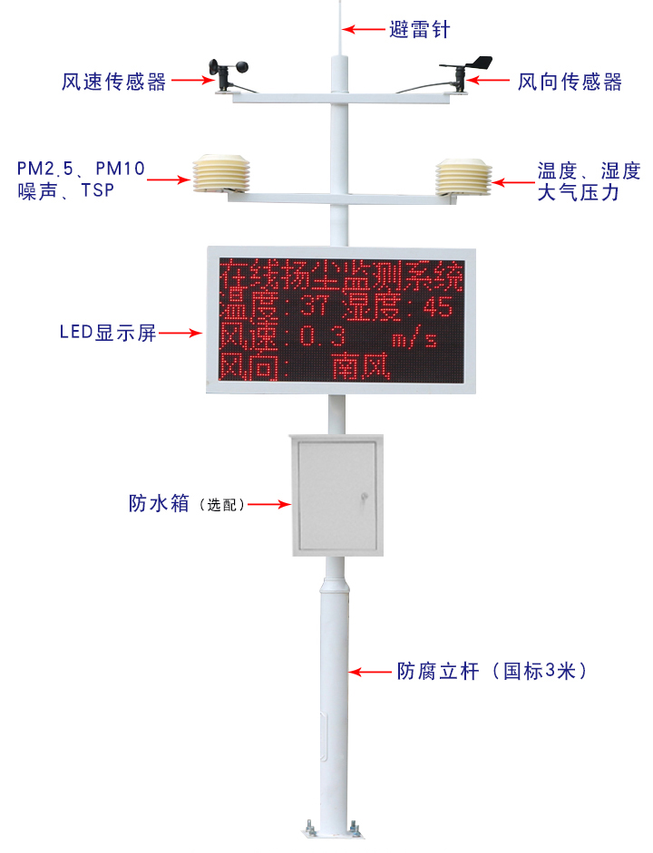 3、傳感器:環(huán)境溫度、濕度、風(fēng)速、風(fēng)向、氣壓、雨量、PM2.5、PM10、噪聲 等各種氣象要素傳感器(可根據(jù)需求選配)。